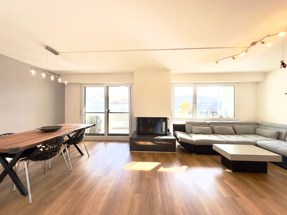 Das Herzstück der Liegenschaft stellt der offene und lichterfüllte Wohnbereich mit Cheminée und direktem Zugang zum überdeckten Balkon, welcher eine wunderbare Fernsicht gegen Süden verspricht, dar.